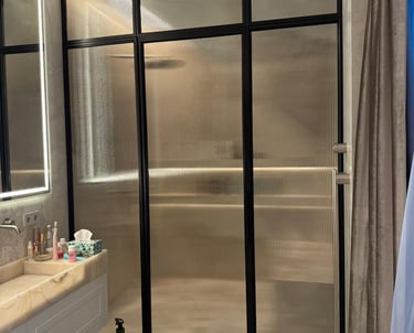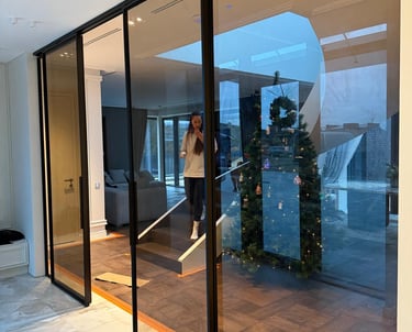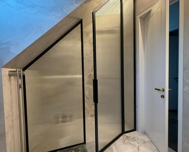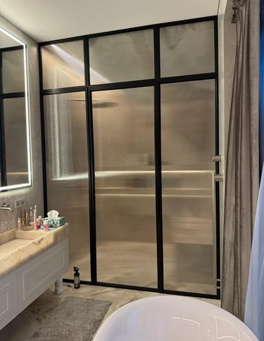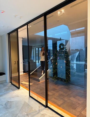 Sliding door partition. The sliding system uses Italian mechanisms with soft close/soft open functionality. The frame is made of 40×20×2 mm black steel, and the glass is 8 mm dark bronze.