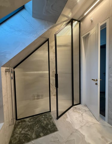 The shower partitions are made from 40×20×2 mm stainless steel profiles, with flutex glass, and magnets are used to secure the doors.