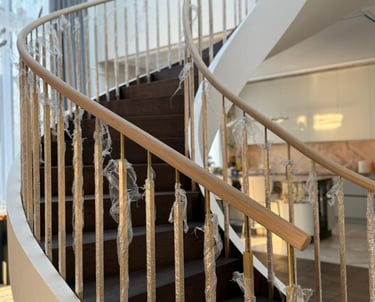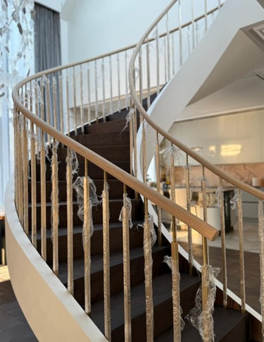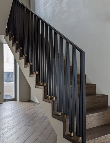 Solid 20×20 brass bars with 12 mm diameter rods for the handrail, made according to the client’s request. The brass was finished with a matte surface while preserving the visible material structure. During the manufacturing and installation process, the brass was coated three times with Renaissance wax to protect and preserve the finish.