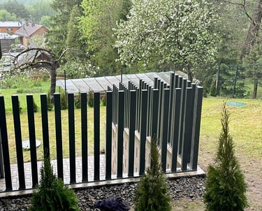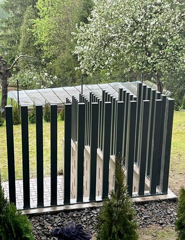 The frame is made from 30×30×2 mm black steel profile, and 10 mm diameter rods were used for the inserts. The railings were primed and powder coated for durability and protection.