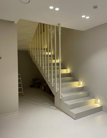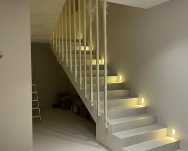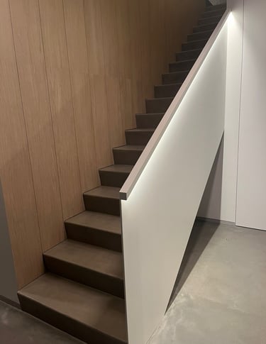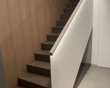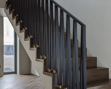 Recently, this style has increasingly been replacing glass railings. The railings are made from 10 mm thick black steel plate, with openings at the top designed for LED lighting. The railings are powder coated for durability and a clean finish.